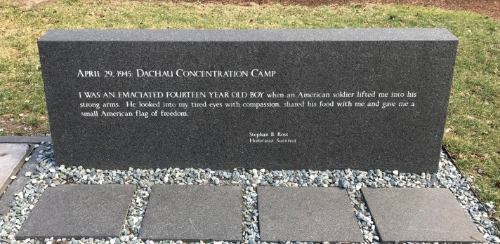 From the waterfront, I walked through the North End and made my way through Haymarket. As I approached Faneuil Hall, I came to the beginning of the Holocaust Memorial and stopped, as I had done on walks before, and read the inscription on a granite marker. It was written by Stephan B. Ross, Holocaust Survivor, and is dated April 29, 1945, at the Dachau Concentration Camp, a place I had visited 27 years earlier. He wrote, “I was an emaciated fourteen year old boy when an American soldier lifted me into his strong arms. He looked into my tired eyes with compassion, shared his food with me and gave me a small American flag of freedom.”
