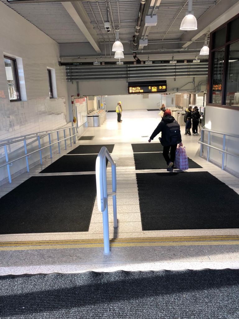 At Braintree Station, the pedestrian bridge is permanently closed. The bridge will be replaced by a new garage lobby featuring elevators and stairwells.