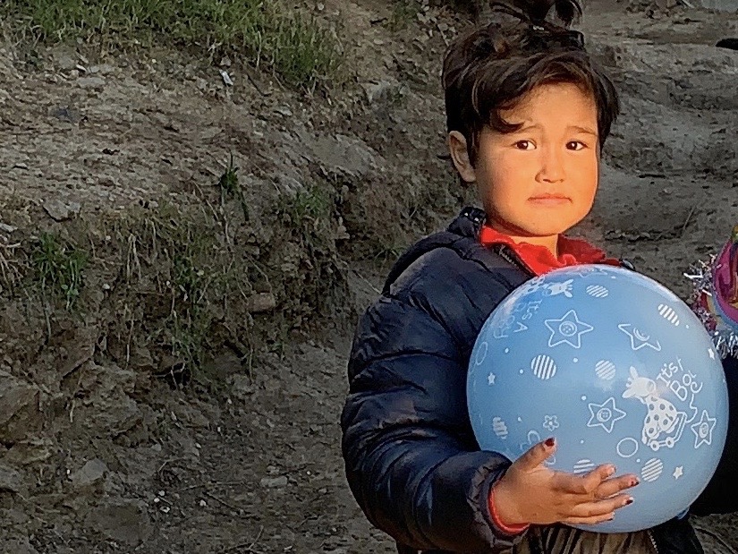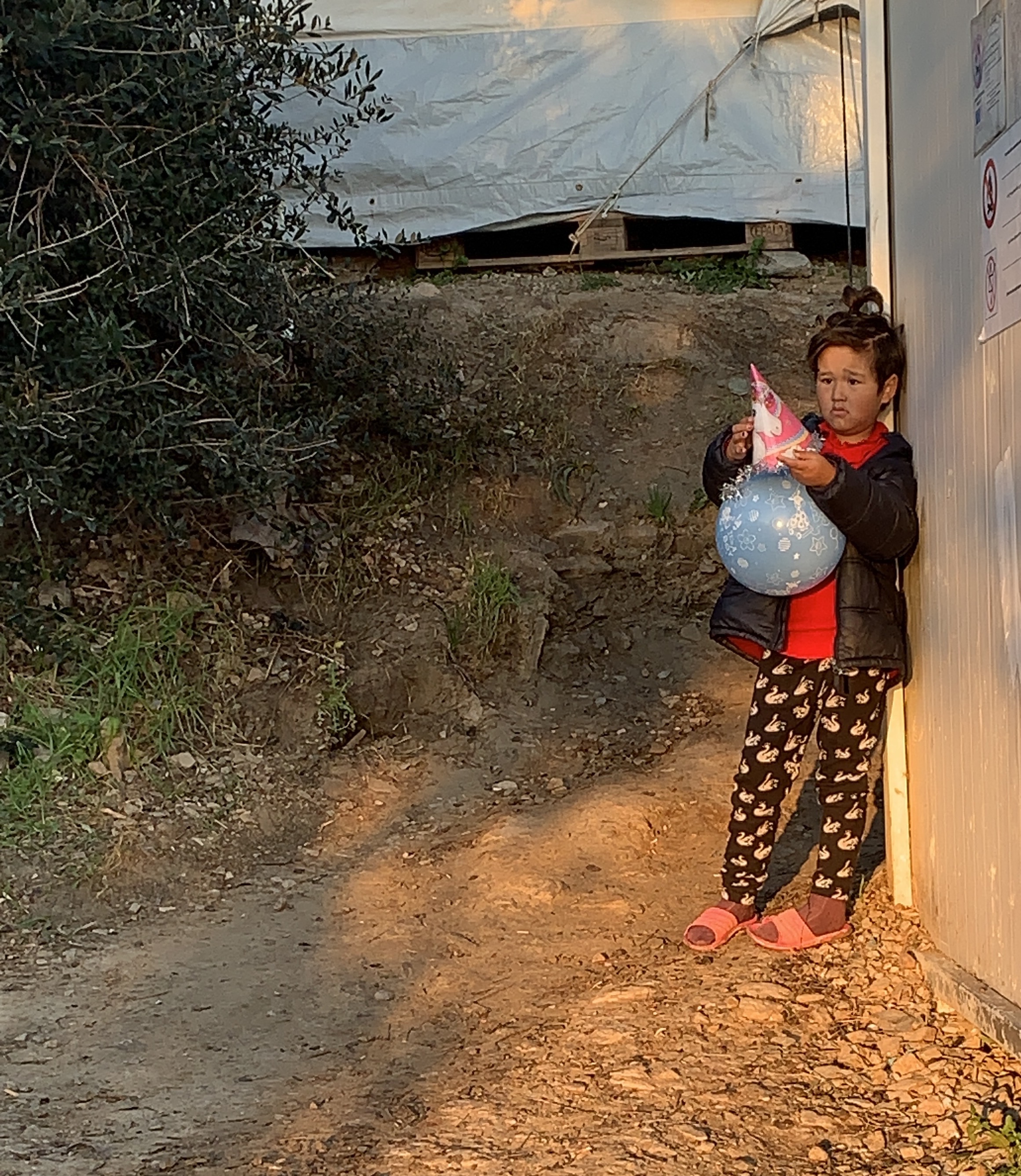I turned to climb the steps and walk away from the Camp, and saw a young girl, caught by the early sun’s rays. She held in her hands a birthday cap and a blue and white balloon.