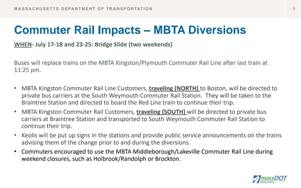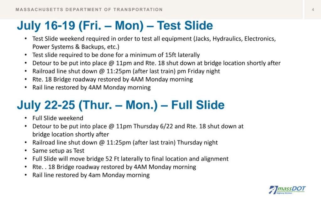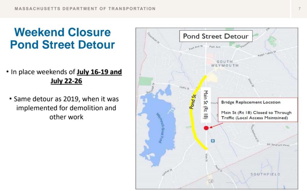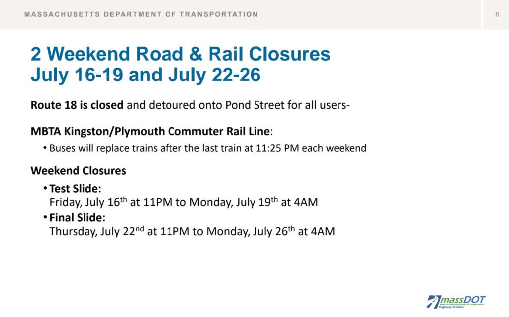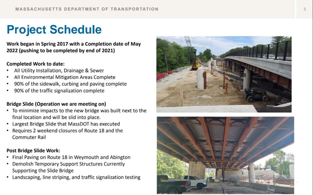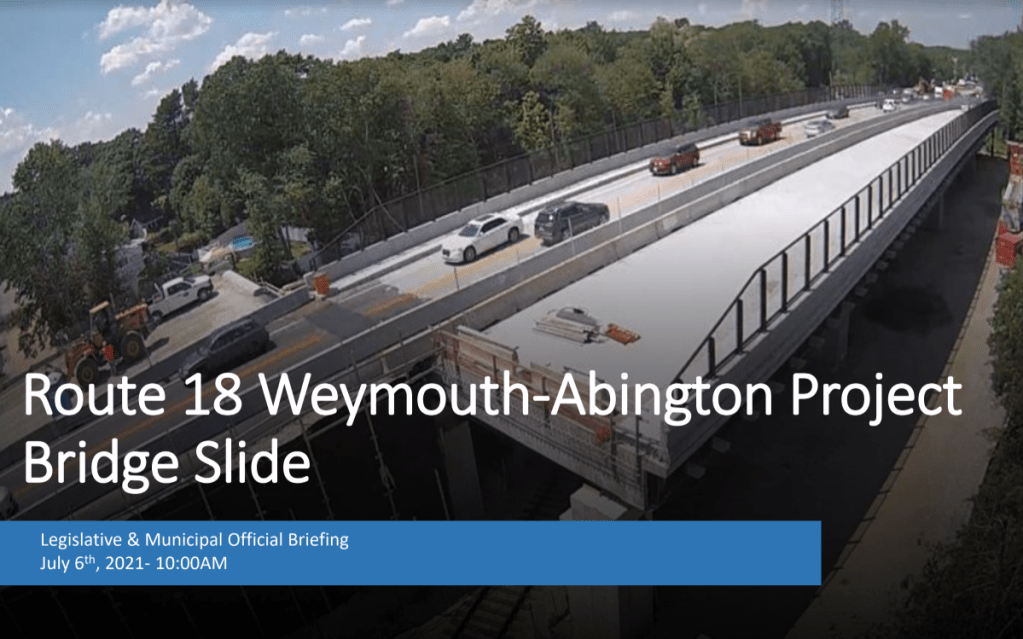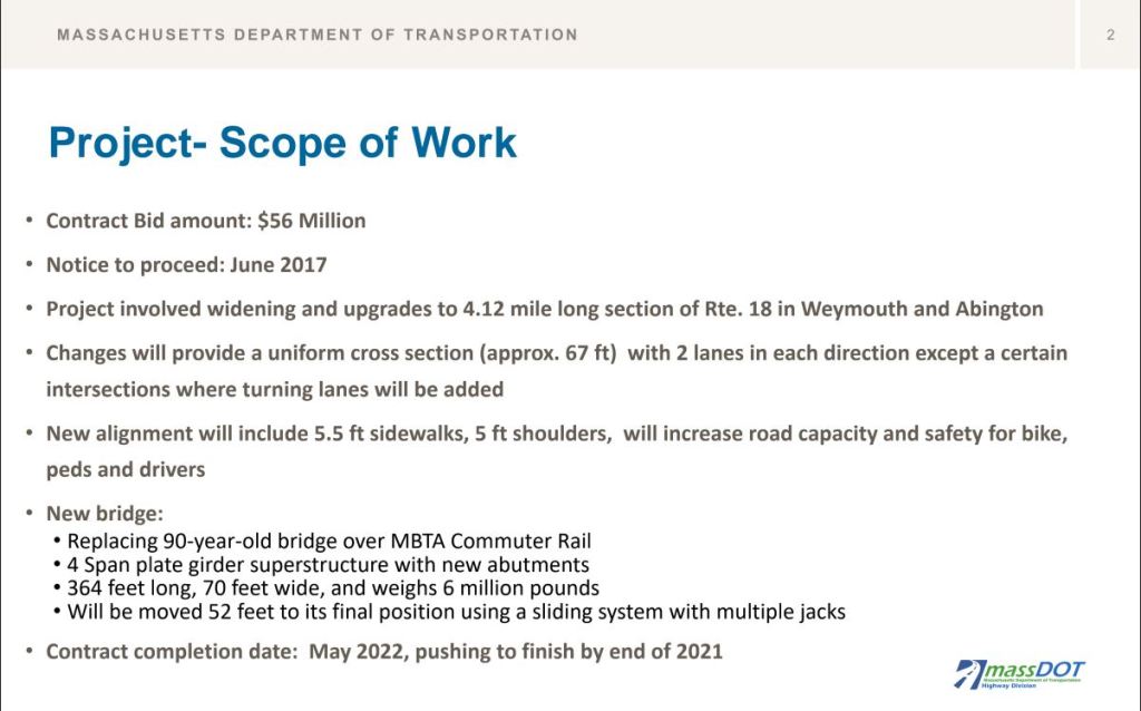 MassDOT’s 7/6/21 presentation on the widening of Route 18 through the communities of Weymouth and Abington, including costs, timeline, and planned traffic detours. Click the slides below to see the presentation.