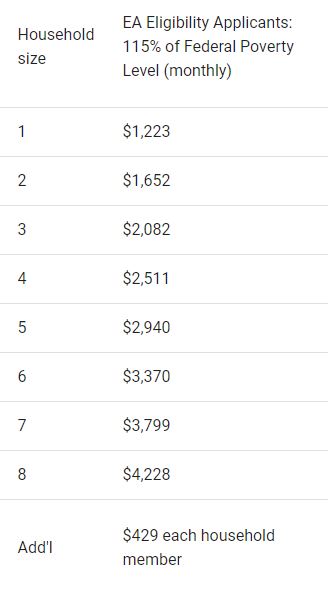 To be eligible for Emergency Assistance as an applicant, your family’s gross monthly income must be below 115% of the federal poverty limit for your family size. The federal government usually increases the amount slightly in January or February of each year.