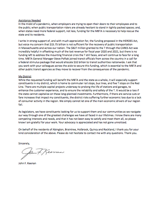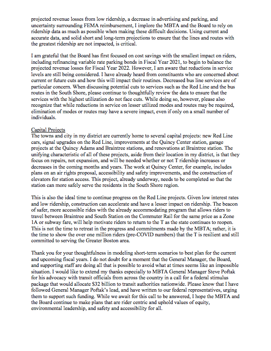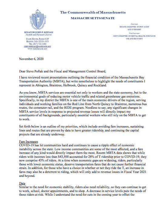 Below is the letter sent to MBTA General Manager Steve Poftak and the Fiscal and Management Control Board in November 2020: