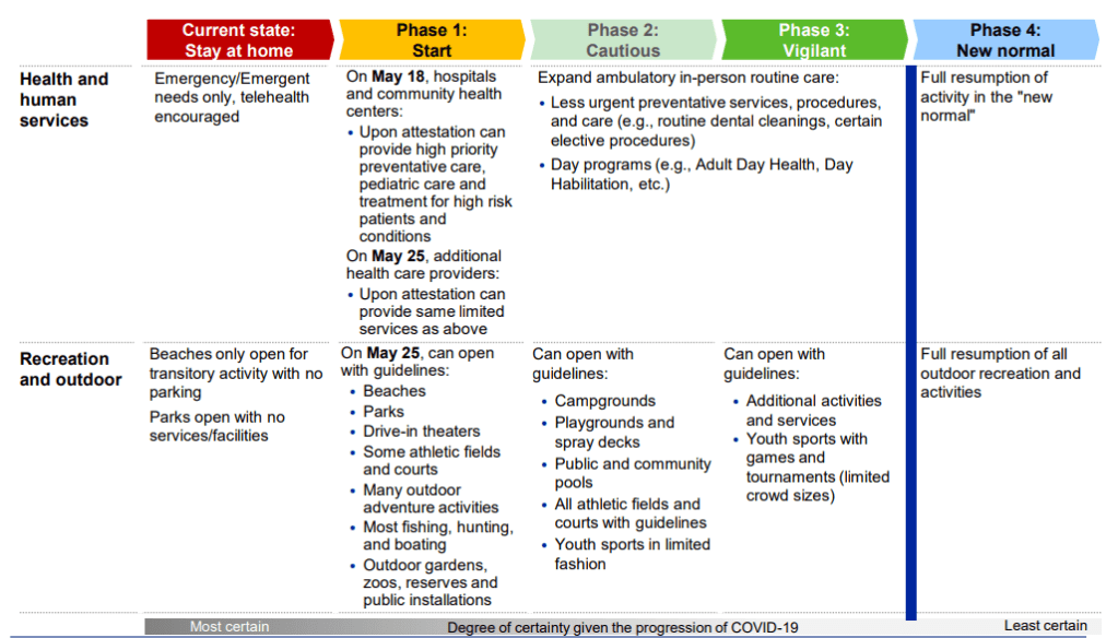 What follows is a graphic of the plan that includes much of the detail relating to the social guidance, gathering sizes, travel, worship, businesses, health and human services, and recreational and outdoor activities.