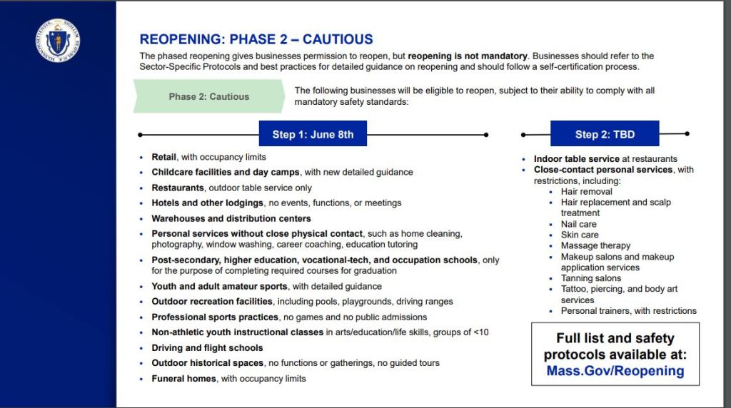 6-19-20 Step 2 of Phase II Reopening. Governor Baker announced that Step Two of Phase II of the Commonwealth’s four-phase reopening plan will begin on Monday, June 22, 2020. Under Step Two of Phase II, additional industries will be allowed to resume operations under sector-specific guidelines. The Commonwealth will proceed to this next step given that public health data trends, such as new cases and hospitalizations, are trending down. Reopening Plan information can be found here.
