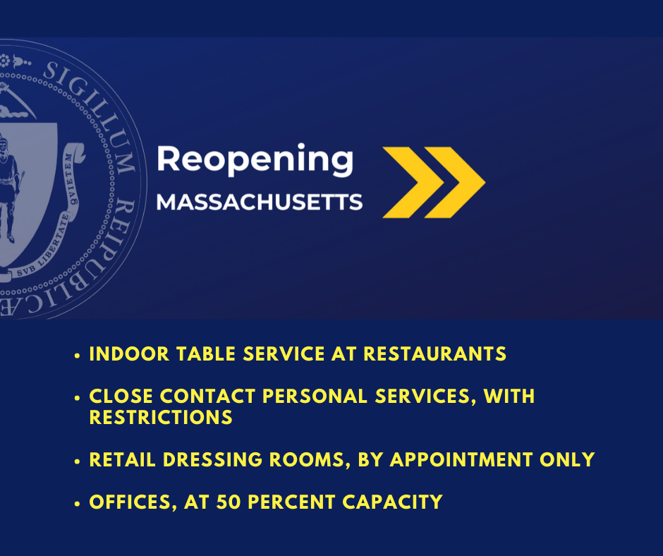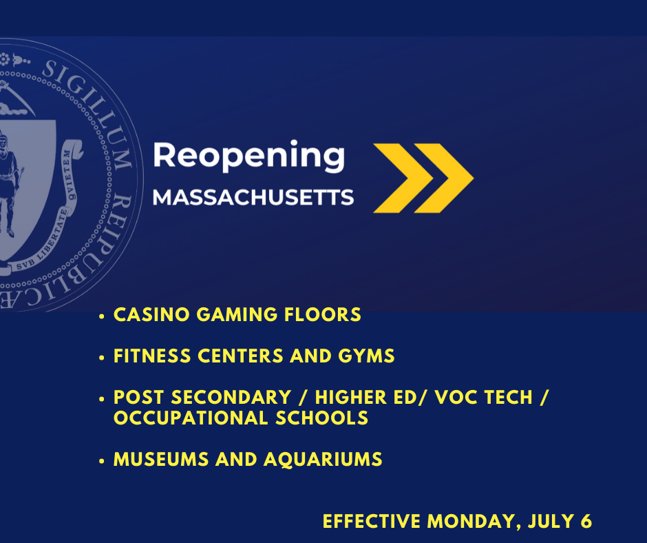 7-2-20 Phase III Reopening. Governor Baker announced that Step One of Phase III of the Commonwealth’s four-phase reopening plan will begin on Monday, July 6, 2020. Under Phase III, additional industries will be allowed to resume operations under sector-specific guidelines. Businesses included in Step One are: