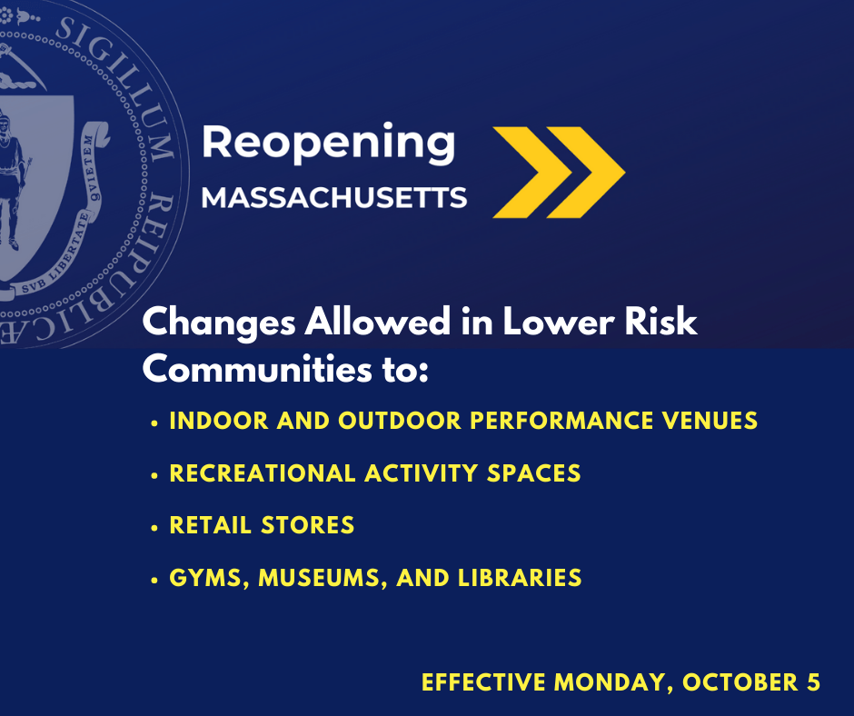 9-29-20 Phase III Step 2 for Lower Risk Communities. According to mass.gov, lower risk communities are those that have not been deemed “red” in any of the last three weekly Department of Public Health weekly reports. For an explanation of what constitutes a red community, click here. Effective Monday, October 5, lower risk communities can: