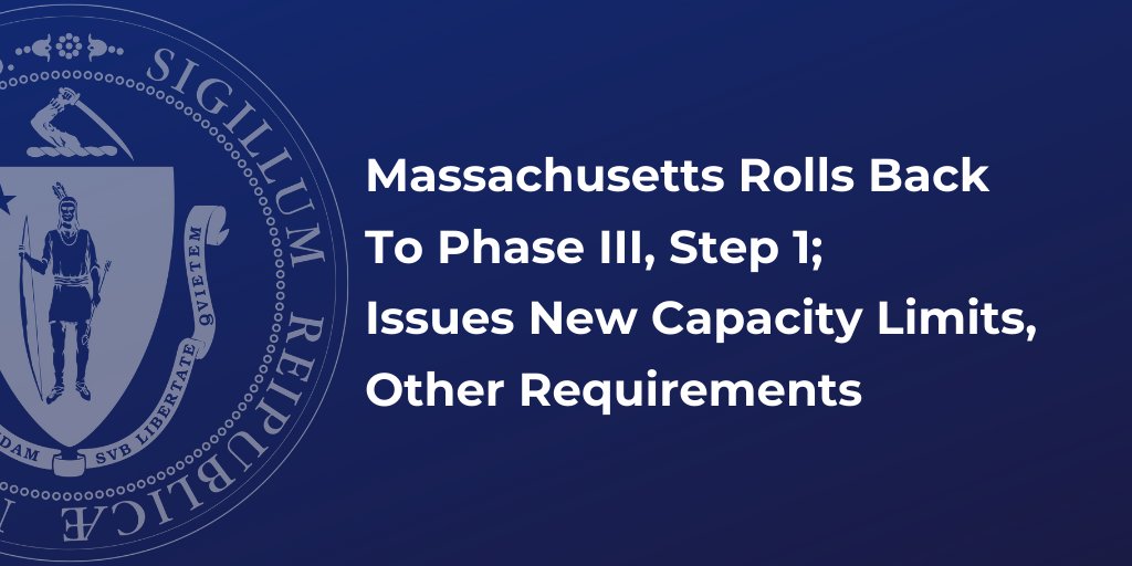 12-8-20 Baker-Polito Administration Announces Statewide Rollback to Phase III, Step 1, Additional Restrictions. Effective Sunday, December 13, all communities in Massachusetts will return to Step 1 of Phase III of the Commonwealth’s reopening plan. Changes include limits on the gathering size of outdoor events, theaters and performance venues; reduced capacity (40%) for most sectors (including gyms, places of worship, retail, and offices); and guidelines for restaurants and their patrons. For a full list of changes, click here.