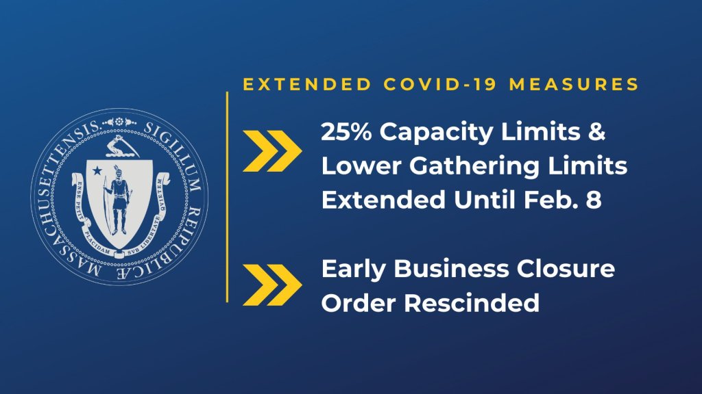1-21-21 Baker-Polito Administration Extends Capacity Limits and Lifts Early Closing Requirement for Businesses. Effective 5AM on Monday, January 25, the 10PM – 5AM Stay at Home Advisory will be lifted on Massachusetts residents, and the Mandatory Early Closing Order, which required certain businesses to close at 9:30PM, will end. For a complete list of businesses this change applies to, click here.