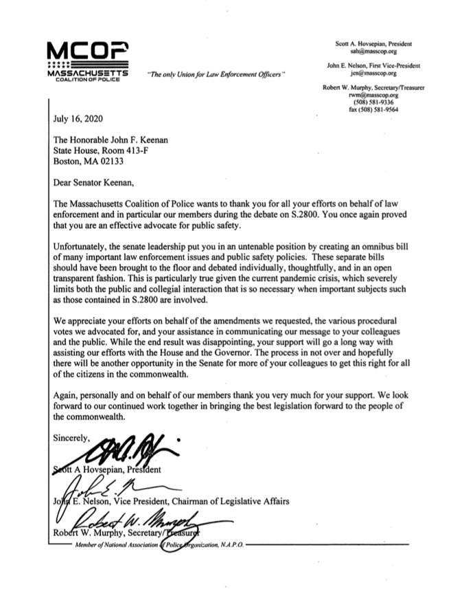 I did my best to raise and address issues most important to law enforcement and public employees through amendments I filed and supported, as well as through my remarks on the Senate floor. I am thankful to the Boston Police Patrol Officers’ Association, the Massachusetts Coalition of Police, and the Massachusetts Police Association for recognizing and expressing appreciation for these efforts.